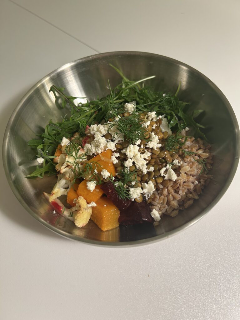 This winter grain bowl recipe combines nutritious winter vegetables, fiber-filled lentils, and nutty kernels of farro to generate a feel-good dish bursting with flavor and essential vitamins & minerals. The abundance of winter is celebrated, making use of the hearty seasonal vegetables that are easy to source and conveniently packed with nutrients our bodies demand most during the dark, cold months. Brown lentils & farro supplement the dish with additional protein, fiber, and alternate textures, balancing the contents to form a satisfying meal. Top everything off with a garnish of flavorful greens, a drizzle of anti-inflammatory dressing, a sprinkle of goat cheese, and your bowl will have checked every box!